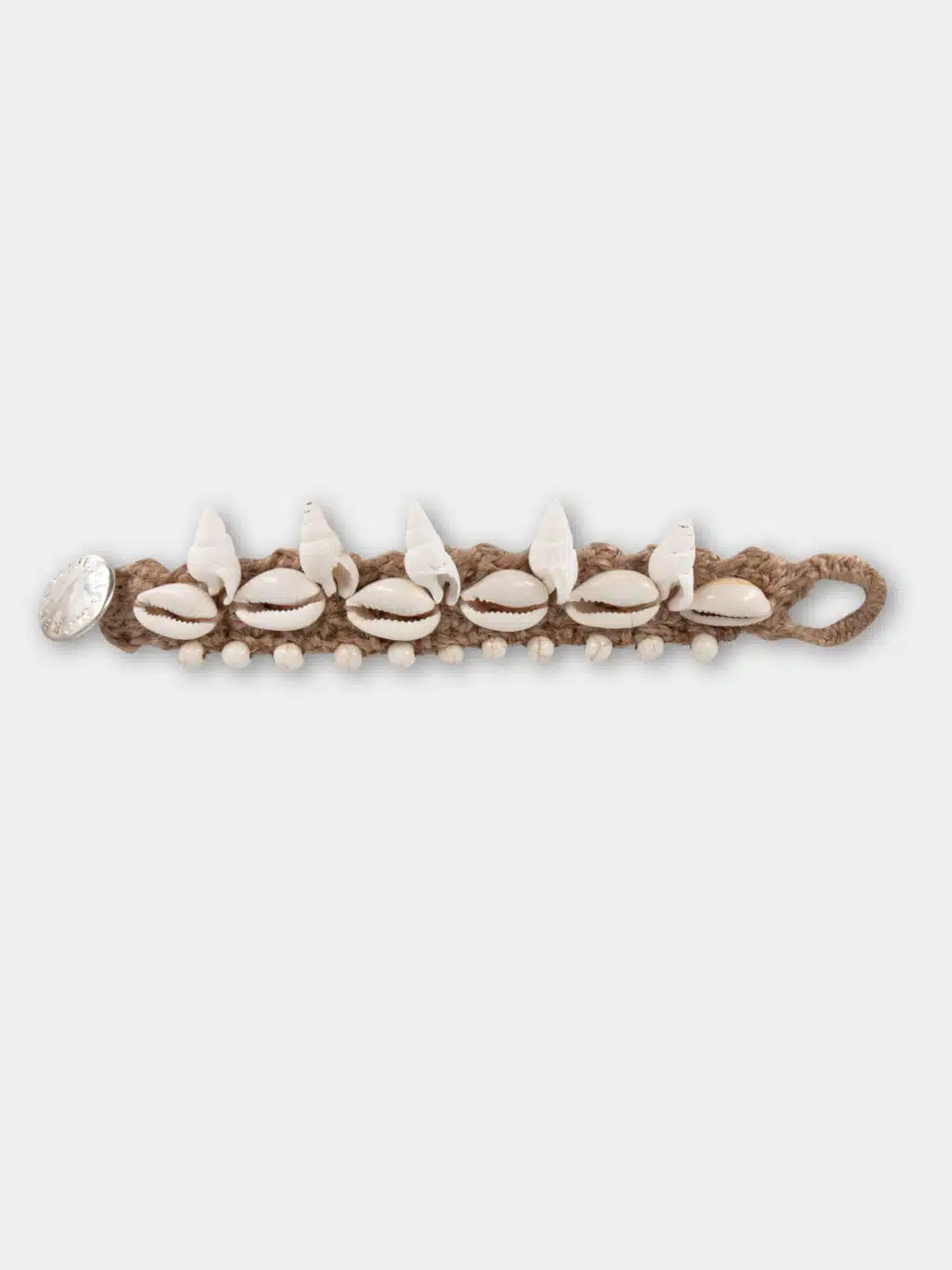Collar con base crochet de algodón y rafia confeccionado a mano decorado con nácar y conchas naturales.